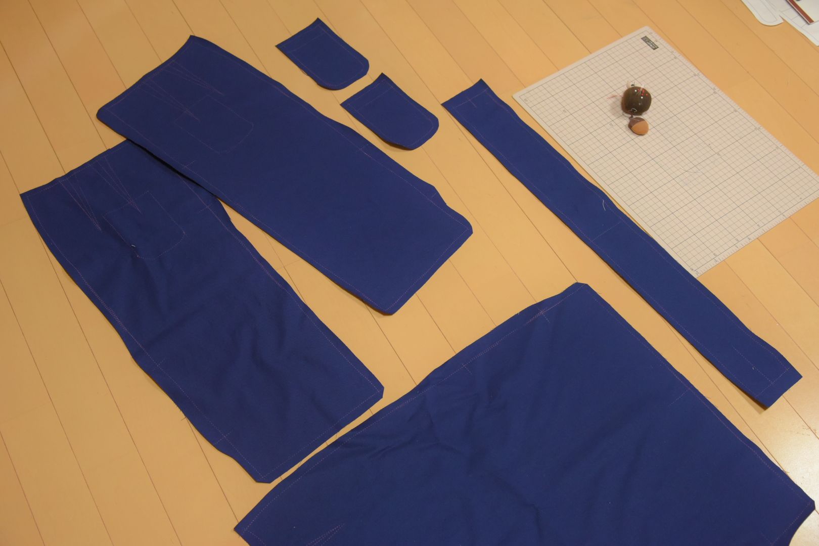 咲夜さん衣装を製作するぞ!(その2) 1 本日の進捗前回は咲夜さんの衣装をトップスの仮縫いまで進めました。今回は、トップスを製作開始……ではなく、スカートに手を付けました。だってブラウスの袖のカタチが決まらないんだもん(`;ω;´)とりあえず型紙はこんな感じ↓です。 ウエスト68cmのヒップ90cm(9号サイズのつもり)。スカート丈は60cmで、裾を型紙上で4cm、都合8cm絞っています。これだと歩けなくなってしまうので、裾に8cmぐらいのスリットを入れました。裏地をキチンとつけようと思うとスリットの製図は相当かなり面倒っぽいです。手元の本を見ながら考えましたが、まぁ、いらんやろ、ということで、気にせずサクッと引いてしまいました。あとは、ヒップの後ろにウエストで止めるためのファスナーを付けるようにしています。両サイドにも、スリットを伸ばすためのファスナーを忘れずつけるようにしています。キックの得意なレイヤーさんに着ていただかないと、無用の長物ですね\(^o^)/で、コレを印刷して切り出して(ここは写真忘れた)、裁断するとこんな感じです↓ パーツ数が少ないとあっという間ですね。2 今後の見通しとりあえず、切り出したパーツを端処理して縫い合わせて、一気にファスナー3本つけて形にしてしまいましょう。どうみても前身頃にアクセントが足りないデザインなので、どうするかは考え中です。エプロンつければ目立たないかなぁ……? PR