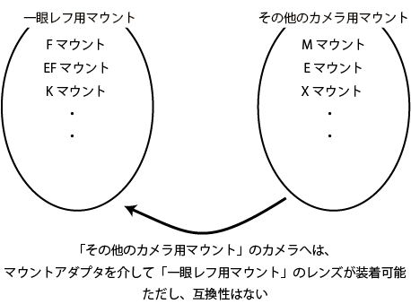 この例外として、「マウントアダプタ」と呼ばれる器具によって、ボディと異なったマウントのレンズを装着できる場合があります。 マウントアダプタは大きく分けて