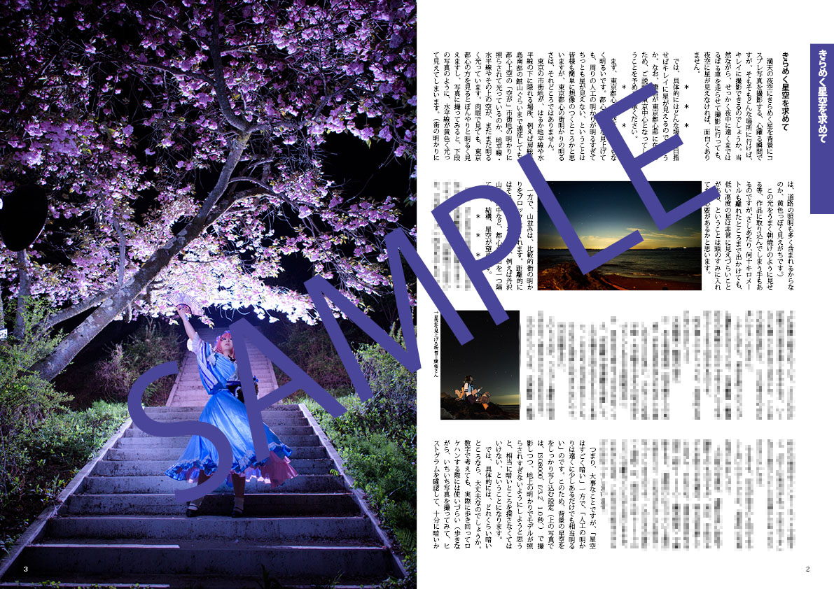 Cosplay & Cars Vol.2 絶賛発売中 コスプレ✕車ロケ本第2弾「Cosplay & Cars vol.2 車ロケの極み 星&夜景ロケ」も、無事に完成いたしました!今回も写真集……ではなく、コスプレ撮影と自家用車の関係を解説する本になります。大筋としては、夜間のコスプレロケ撮影のやり方をご紹介しながら、車があると便利ですよ!自家用車があるといいよ!と売り込んでいく流れとなっております。車要素は、前作に比べると大分控えめかも知れません。星空や夜景を背景にした夜ロケの写真っていいな!と思われた方は、ぜひお買い求めください。夜ロケってどうやって待ち合わせて、どんな感じで出かけているのか、夜ロケ撮影に行くときにはどんな道具を用意していくとよいのか、そして夜ロケの写真はどんな手順で撮影しているのか、もろもろ解説されてあります。また、コスプレイヤーの皆様に、夜ロケに出かける際に気になる点にインタビューを行い、伺ったところを記事にまとめてあります。こちらも併せて参考になるかと思います。射命丸文と東風谷早苗の二人をモデルに、夜ロケ撮影の様子をご紹介していく本ですが、素敵なモデルさんは、表紙のあややが、まりもさん(@YOYOrogerXX)本文は更にマナティさん(@manatyY2I)に、主にお願いしております。(その他、幸さん(@sachi699)、ひすみさん(@hisumin_186)、葉桜さん(@Irppy3)にもご登場頂いております)2018年10月14日(日)の博麗神社秋季例大祭さ04aにてオフライン初売予定1冊500円です。当日来れない方、後から欲しい方は、筆者のTwitterアカウント( @203mmH )にて絶賛自家通販中ですので、ご連絡くださいませ!