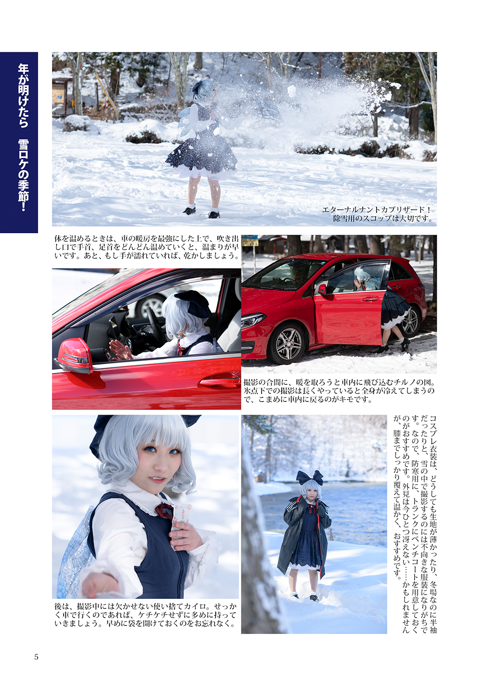 Cosplay & Cars vol. 3 “年が明けたら 雪ロケの季節!” 発売! 2019年春例大祭の新作、東方Project コスプレ写真集「Cosplay & Cars vol. 3 年が明けたら 雪ロケの季節!」boothで発売中です!https://203mmh.booth.pm/items/1367486A4 フルカラー本文24ページ 500円。冬といえば雪ロケ、でも雪ロケの写真はどんどん流れてくるけど、実際にどんな感じでロケに行ってるのかは情報がない……!ということで、解説本を作っちゃいました。 表紙の写真は、モデルは雨宮せつなさん( @amaya_moment2 )さんにお願いして長野の木崎湖キャンプ場まで雪ロケに行ったときのものです。2018年12月31日、冬コミが終わるなり東北ロケに突撃したときのお話&写真など、雪ロケの行き方・撮り方を詰め込みました!さらに、シリーズで初めて(!)他の方の車を紹介させていただきました。艦これレイヤーのYuさんに、ハイエースを見せていただき、取材しています。Bクラスとは桁違いの積載量をぜひお楽しみください!