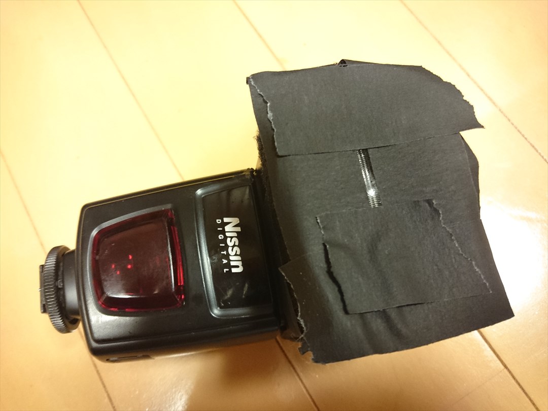 ストロボのパワーを限界を超えて下げる話 1.問題点夜間のコスプレ撮影で、暗い背景を写そうとすると、どうしてもISOを上げまくり、絞りも相当開いた設定にする必要があります。例えば、ISO6400, F2.0とか、そういった設定になります。その状態で、(クリップオン)ストロボでモデルを照らそうとすると、ストロボのパワーを最小の1/128に設定しても、パワーが強すぎて、下の画像の様にモデルが白飛びしてしまうことがあります。まず、次のイメージ写真のようにモデル(トルソー)とソフトボックスを配置して、撮影することを考えます。 この時、露光量の設定は、背景の山を映すことを狙って、ISO6400, F1.8としているとしましょう。(ストロボ撮影なので、露光時間はモデルの露光量に関係ありません)その設定で撮影すると……パワー1/128でも、↓の様に白飛びしてしまいます。 勿論ストロボとモデルの距離を離して調節することは可能ですが、早々都合よくライトスタンドを立てられる場所があるとは限りませんし、灯りを遠くすると、影が強めに出てしまうのも好ましくありません。2.解決策そこで解決策として、黒のパーマセルテープを使います。こんな感じ↓で、クリップオンストロボの発光面を、どんどん覆っていきます。かなり覆ってしまわないと、パワーが下がらないので、ほんの少し発光面が残る程度まで覆ってしまいます。 こうすれば、同じ1/128の設定のままでもストロボから外に出る光が減るので、モデルに届く光量はちょうどよくなる、という寸法です。 上の写真が、ストロボの発光部を覆った以外、同じ設定でもう一度撮影した例です。このように、調度良い露光になりました。こうやって発光面を覆ってしまうと、ストロボの熱がテープに溜まってしまいますが。もともと最小パワーなので、余り問題はないと思います。間違ってパワーを1/1に設定した状態で、こうやって覆ってしまうと、蓄積した熱でその内テープが燃えかねないのでご注意ください。にほんブログ村にほんブログ村