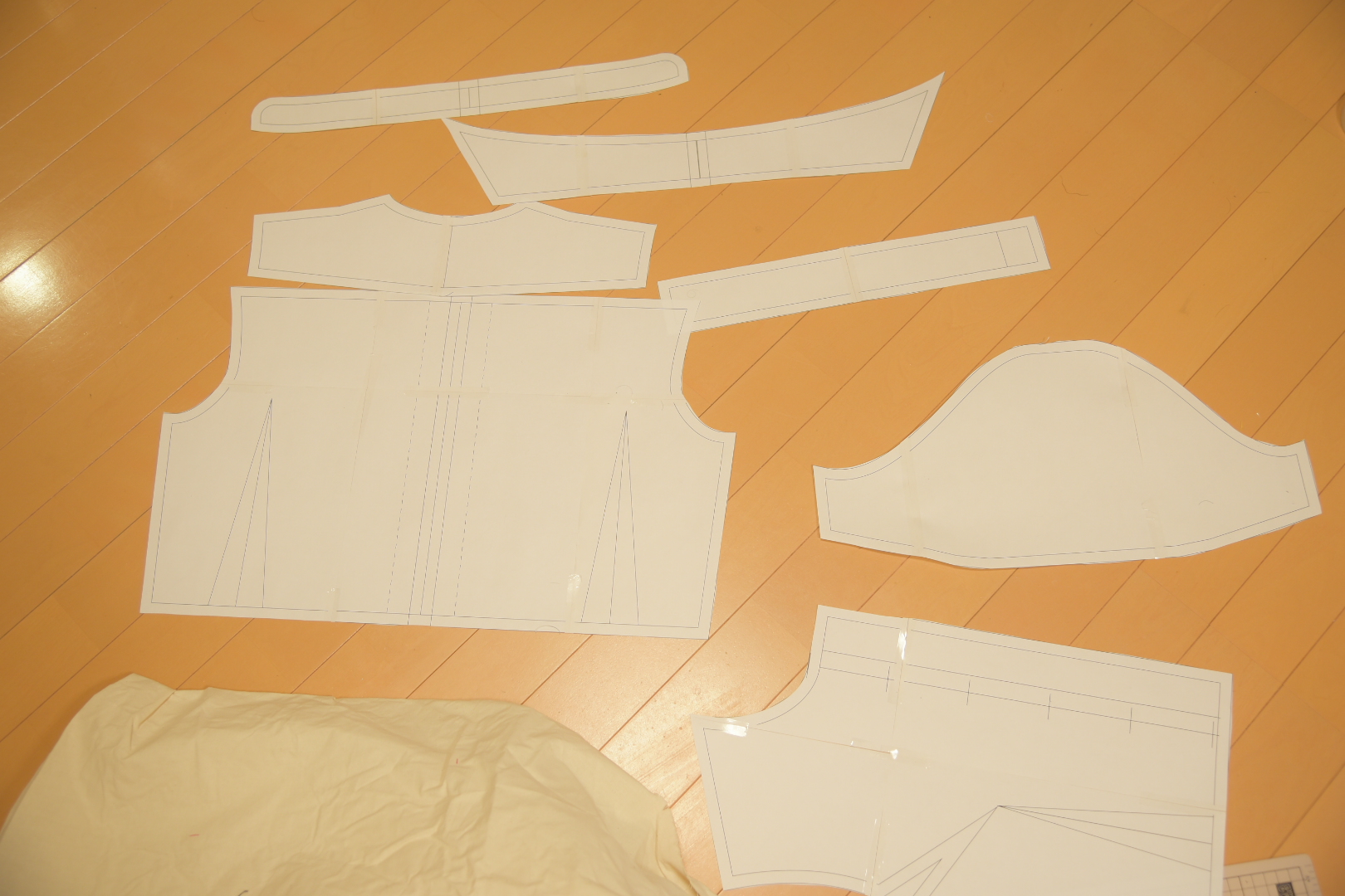 咲夜さん衣装を製作するぞ!(その2) 1 本日の進捗前回は咲夜さんの衣装をトップスの仮縫いまで進めました。今回は、トップスを製作開始……ではなく、スカートに手を付けました。だってブラウスの袖のカタチが決まらないんだもん(`;ω;´)とりあえず型紙はこんな感じ↓です。 ウエスト68cmのヒップ90cm(9号サイズのつもり)。スカート丈は60cmで、裾を型紙上で4cm、都合8cm絞っています。これだと歩けなくなってしまうので、裾に8cmぐらいのスリットを入れました。裏地をキチンとつけようと思うとスリットの製図は相当かなり面倒っぽいです。手元の本を見ながら考えましたが、まぁ、いらんやろ、ということで、気にせずサクッと引いてしまいました。あとは、ヒップの後ろにウエストで止めるためのファスナーを付けるようにしています。両サイドにも、スリットを伸ばすためのファスナーを忘れずつけるようにしています。キックの得意なレイヤーさんに着ていただかないと、無用の長物ですね\(^o^)/で、コレを印刷して切り出して(ここは写真忘れた)、裁断するとこんな感じです↓ パーツ数が少ないとあっという間ですね。2 今後の見通しとりあえず、切り出したパーツを端処理して縫い合わせて、一気にファスナー3本つけて形にしてしまいましょう。どうみても前身頃にアクセントが足りないデザインなので、どうするかは考え中です。エプロンつければ目立たないかなぁ……?